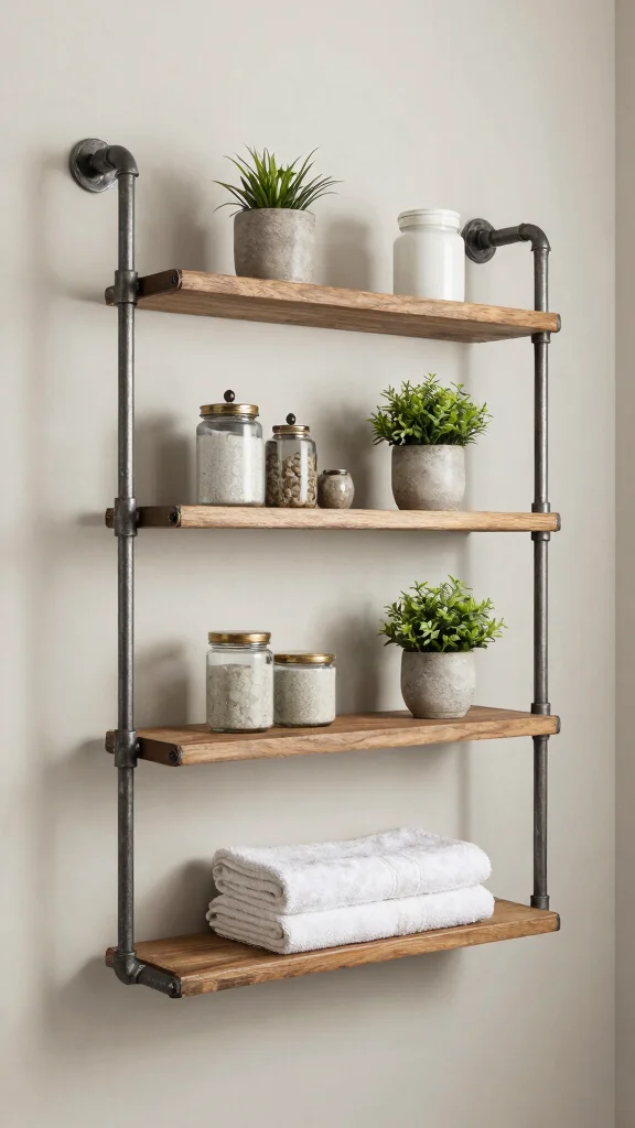 Industrial pipe shelves provide a bold yet practical option for adding personality to your bathroom.