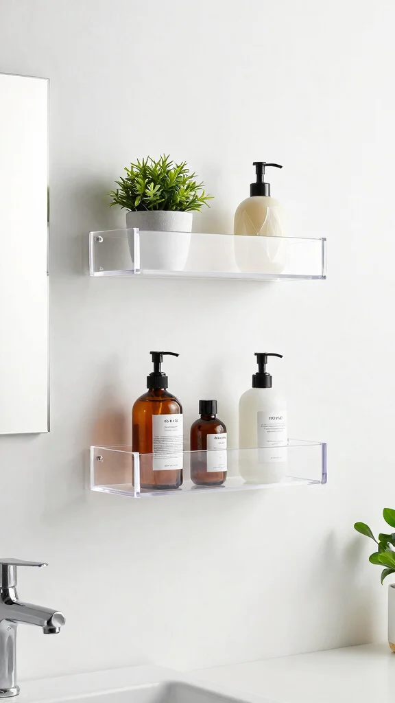 Acrylic floating shelves offer a stylish way to enhance your bathroom’s organization while keeping the overall look clean and airy.