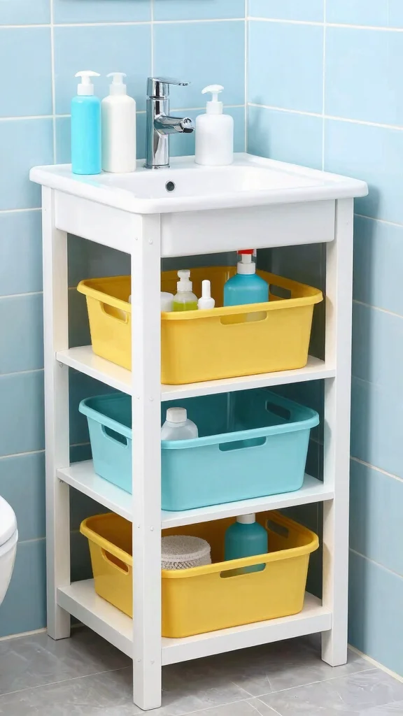 Tip: measure your sink width and vertical clearance, pick shelves with adjustable heights if possible, and use baskets or small bins on each shelf for bathroom organization and space-saving solutions. These bathroom sink shelves blend into your space as decorative shelving that offer functional decor ideas.