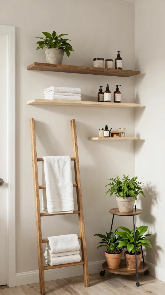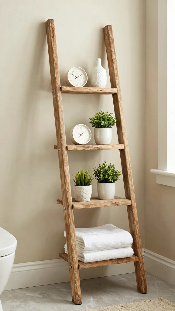 Introduce rustic charm into your bathroom with a vintage ladder shelf that leans elegantly against the wall. This stylish unit offers ample storage without occupying much floor space, making it perfect for hanging towels, displaying plants, or showcasing decorative pieces. Its unique design acts as both a functional storage solution and a captivating decor item.