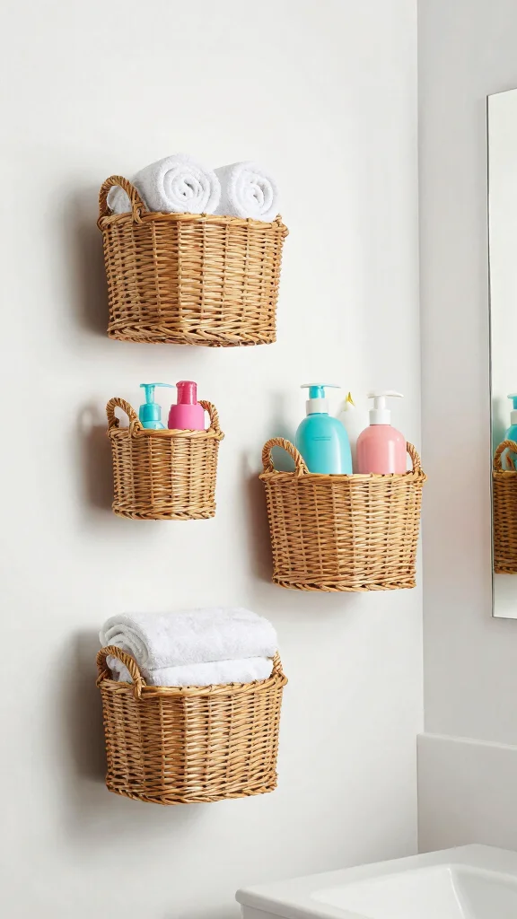 Wall-mounted baskets not only keep your bathroom organized but also elevate its overall decor with their charming design.