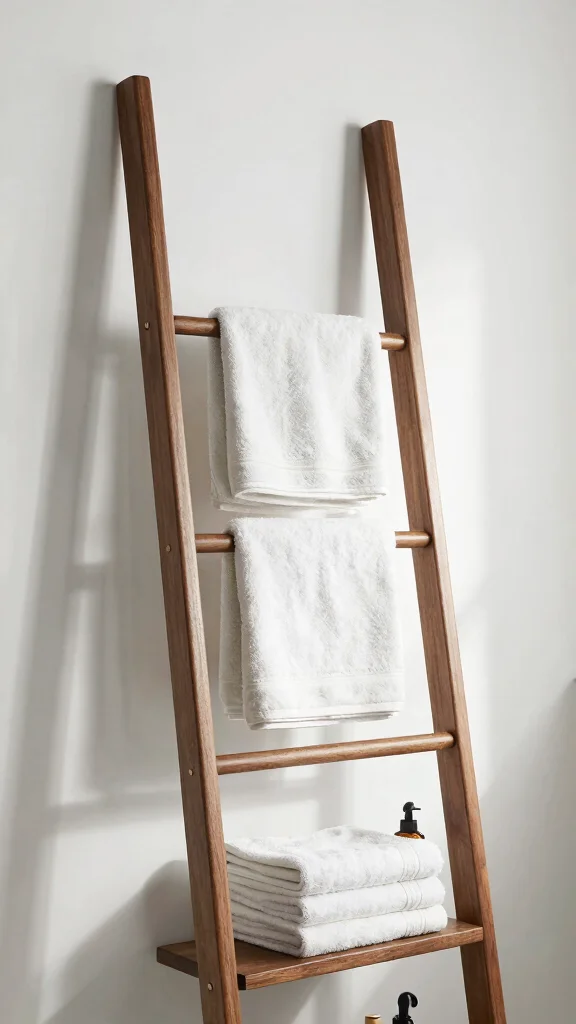 A vintage ladder shelf effortlessly brings a cozy vibe to your bathroom while creatively utilizing vertical space.