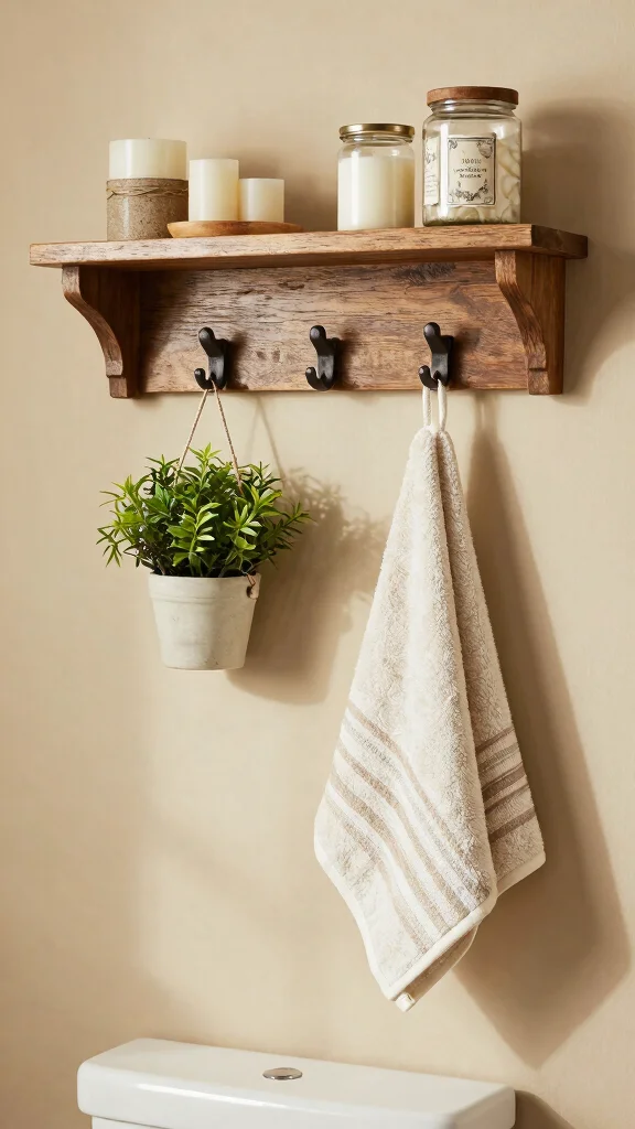 Adding decorative hooks to your shelves above the toilet can elevate both style and functionality. These hooks can hold small towels, scarves, or even hanging plants, resonating beautifully with your rustic decor—think wrought iron or reclaimed wood for authenticity.