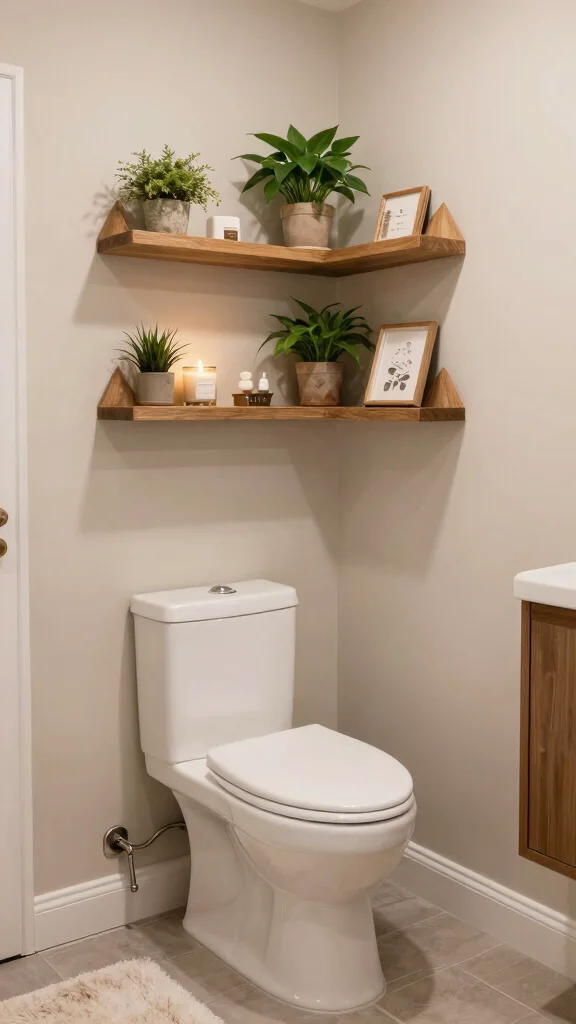 Corner shelves are perfect for maximizing space in your bathroom. These shelves fit snugly into the corner above the toilet, making use of every inch without sacrificing style. Consider triangular wooden shelves or pre-made corner units to add both depth and storage capability.