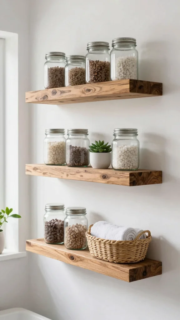 Floating reclaimed wood shelves offer both beauty and practicality, allowing you to create a space that feels inviting and stylish. The combination of natural textures and thoughtful organization transforms your bathroom into a cozy haven.
