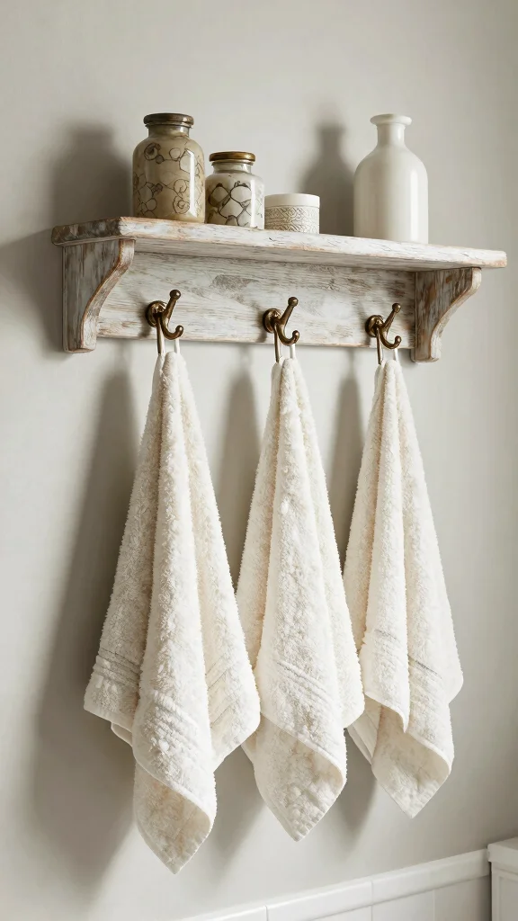 A floating shelf with hooks can enhance your bathroom’s organization while adding rustic charm, making it a practical and stylish element that transforms your space.