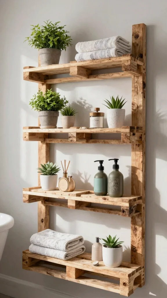 Using rustic pallet shelves can introduce a unique, handcrafted feel to your bathroom. These eco-friendly options often require minimal modifications and can be customized to fit your specific needs. Imagine the warmth and character they bring, making your space feel welcoming and personal.