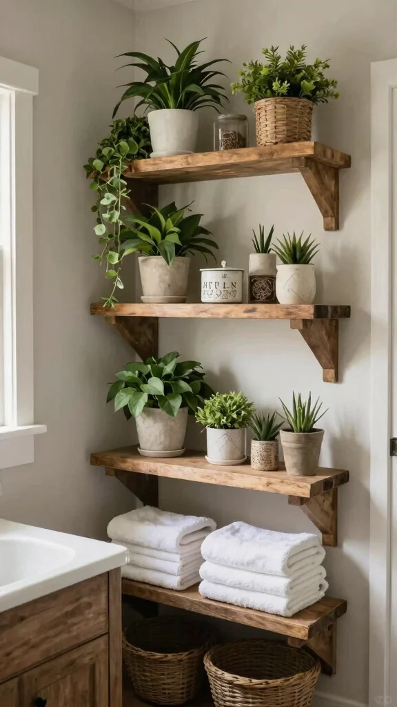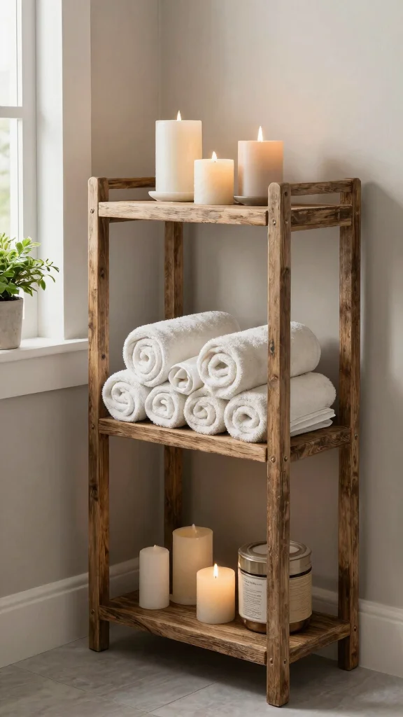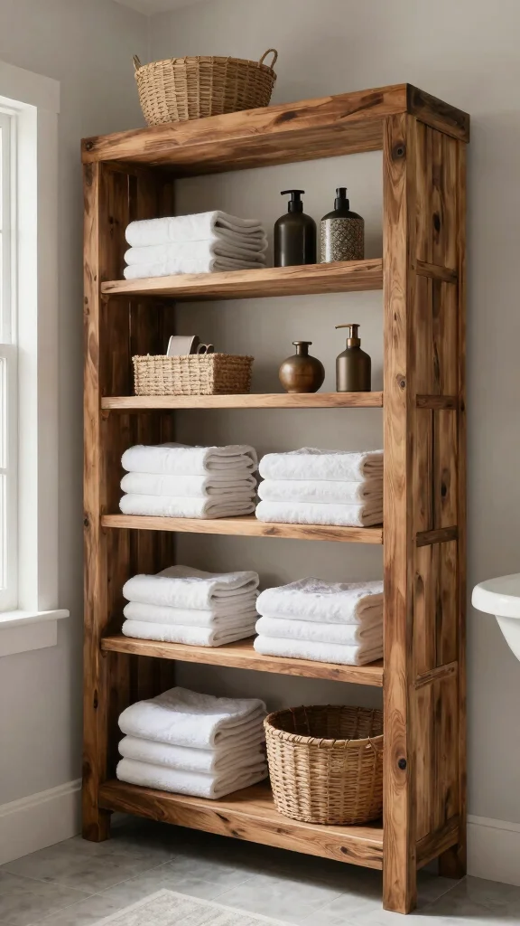 A reclaimed wood shelving unit can elevate your bathroom storage while emphasizing a rustic theme, creating a space that feels both functional and beautifully curated.