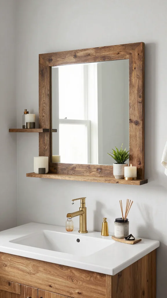A rustic mirror with shelving can transform a simple bathroom into a chic and functional space, providing both utility and beauty that elevates your decor.