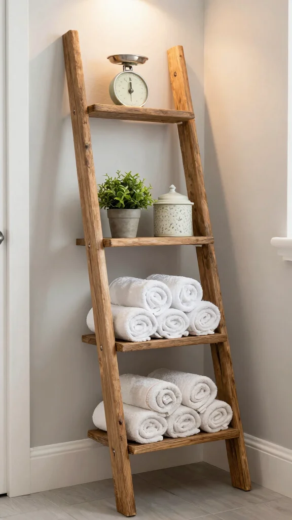 Fun fact: A ladder shelf can instantly add 15–20% more perceived height to a small bathroom, making it feel wider. Use it to showcase fluffy towels and plants, transforming farmhouse bathroom shelves into a chic, practical display.