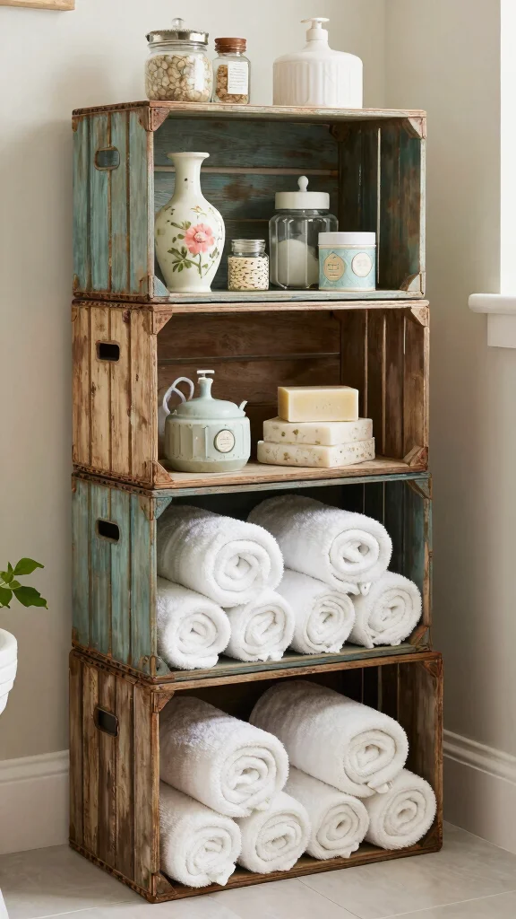 Vintage crates not only provide functional storage but also enhance your bathroom’s rustic vibe, making it a warm and inviting space.