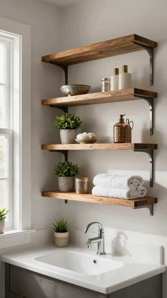 Open shelving above the vanity can elevate your bathroom’s design, turning a practical area into a stunning focal point that showcases your style.