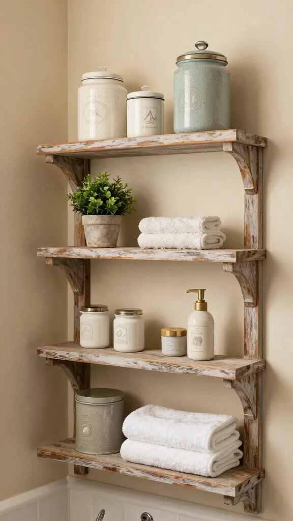 Incorporating distressed wooden shelves can bring a touch of history to your bathroom, creating a cozy retreat that feels inviting and personal.