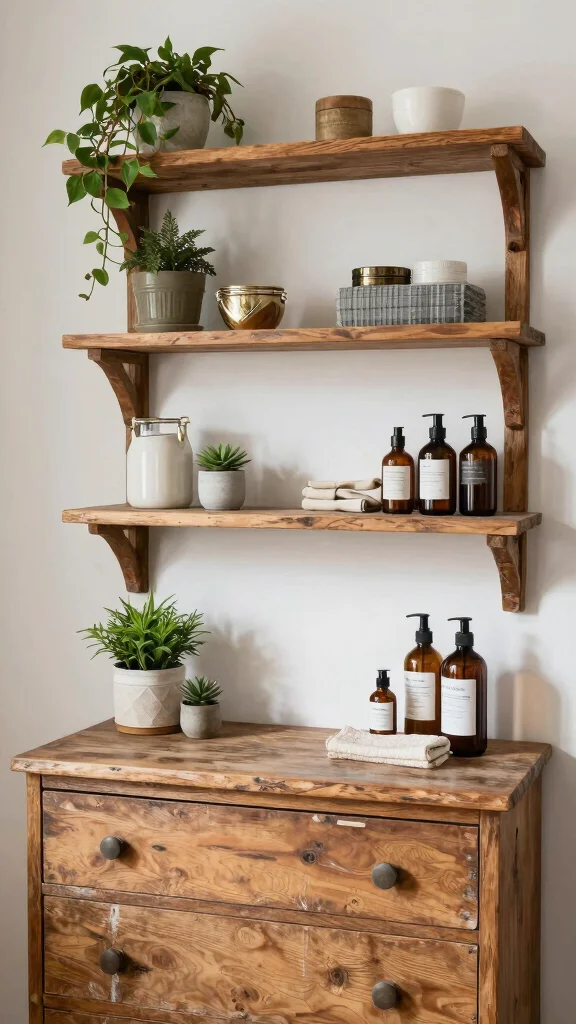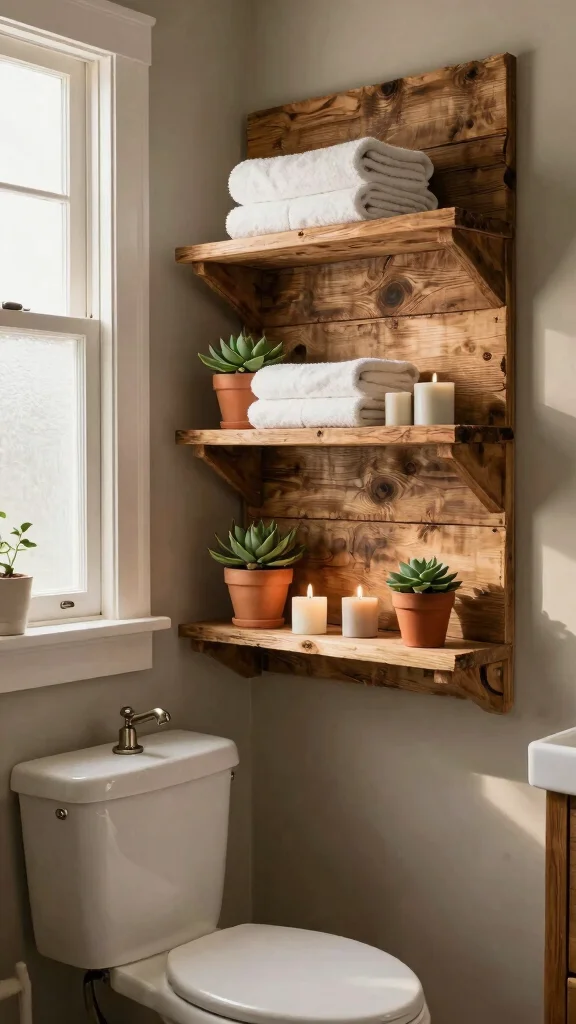 Maximize your rustic shelves by utilizing often neglected wall space, especially above the toilet, creating a stunning focal point for your bathroom. Affordable reclaimed wood can often be found at local hardware stores or online marketplaces, making this project budget-friendly while adding character to your space.