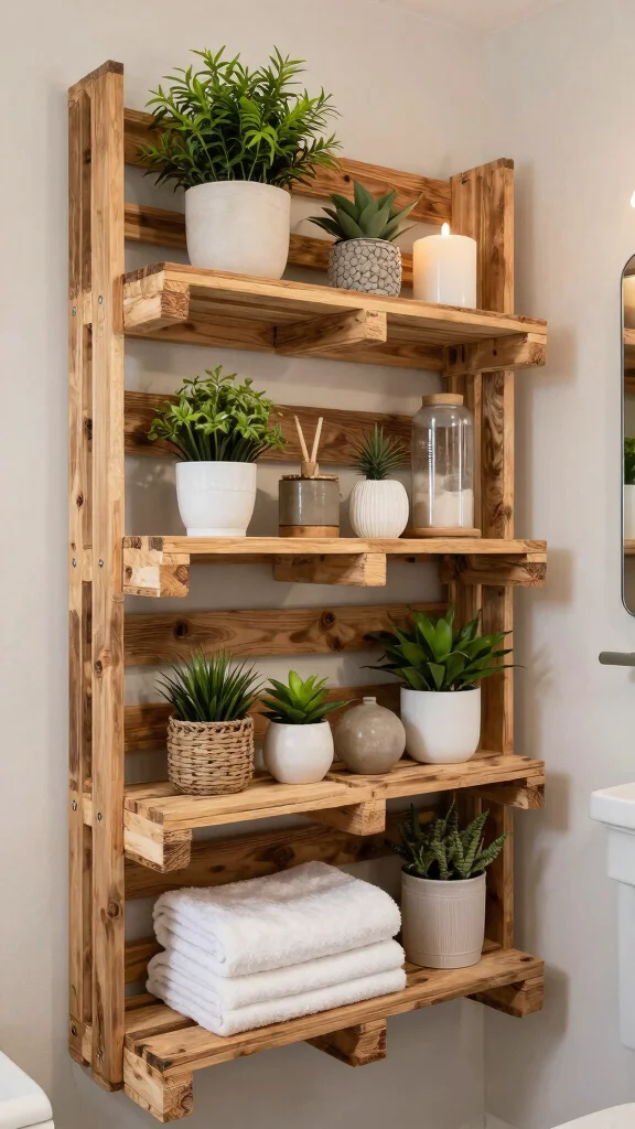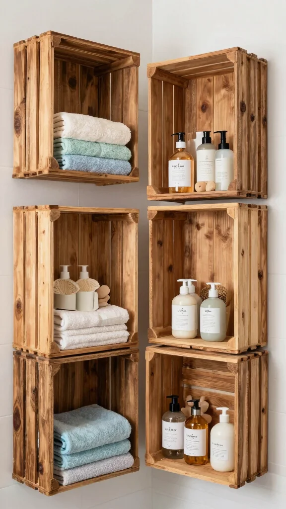 A DIY ladder shelf or rustic crate mounted on wall brackets adds vertical flair without breaking the bank—perfect for space-saving decor and bathroom storage solutions.