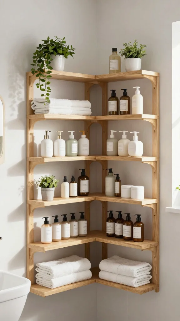 Maximize every inch of your bathroom with open corner shelves. These shelves are ideal for smaller spaces, providing a unique storage option that enhances the room’s flow. By positioning them in a corner, you can display beautiful items while keeping essentials easily accessible.
