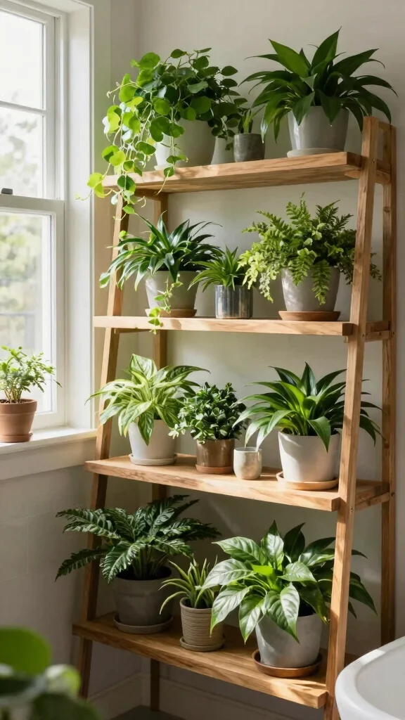 If you love plants, tiered plant shelves can create a stunning focal point in your bathroom. These multi-level shelves allow you to display a variety of greenery, transforming your bathroom into a lush, calming oasis. Not only do plants beautify the space, but they also help purify the air, enhancing your overall environment.