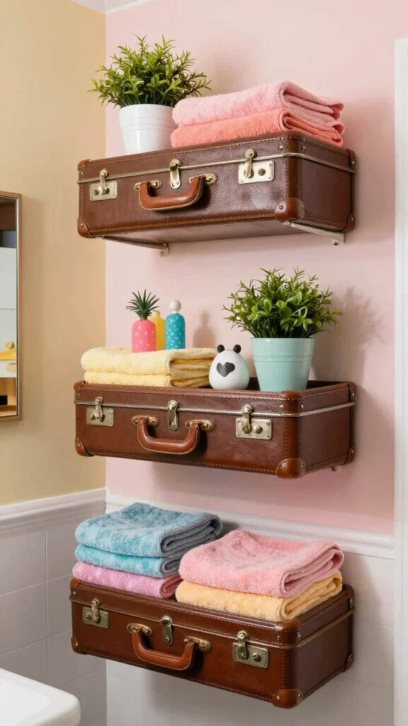 Add a touch of whimsy to your bathroom with vintage suitcases as hanging shelves. These charming pieces not only serve as functional storage but also tell a unique story, infusing personality into your space. Mount them on the wall to hold everything from towels to beauty products, creating a cozy atmosphere that feels both inviting and eclectic.