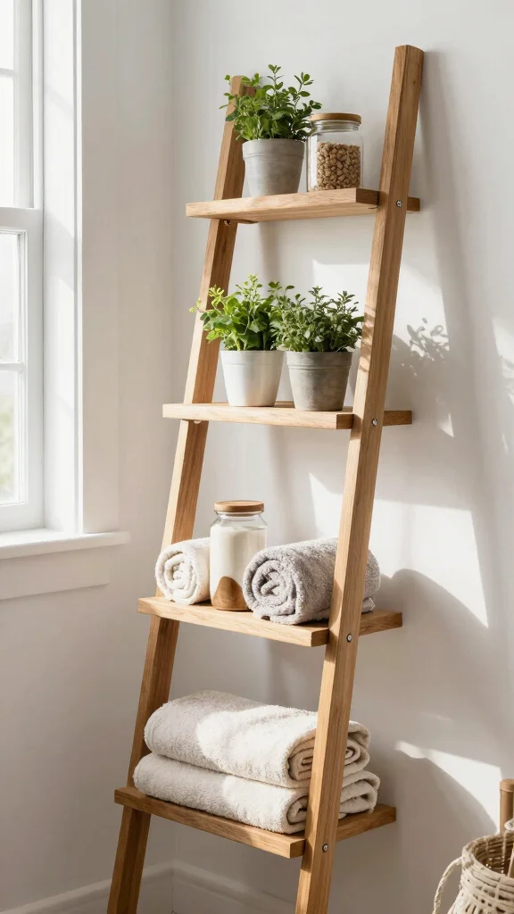 Enhance your ladder shelves by decorating them with matching storage baskets for a cohesive look. The top rung can be used to display plants or artwork, while the lower levels keep towels easily accessible.