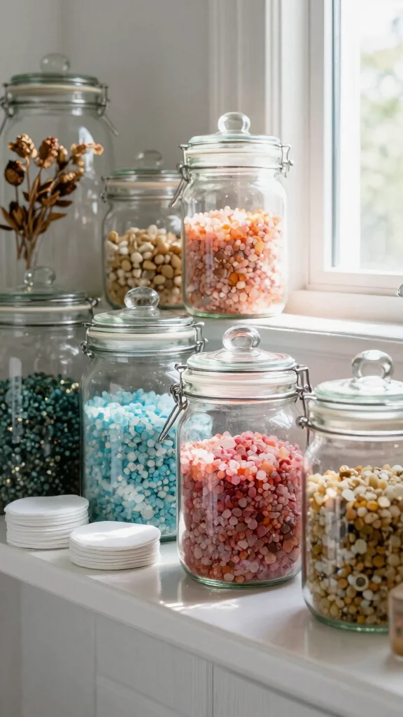 Labeling each jar makes it easy to find what you need, and mixing sizes creates an interesting visual display. You can also add small LED lights to create a soft glow, adding warmth to your bathroom ambiance.