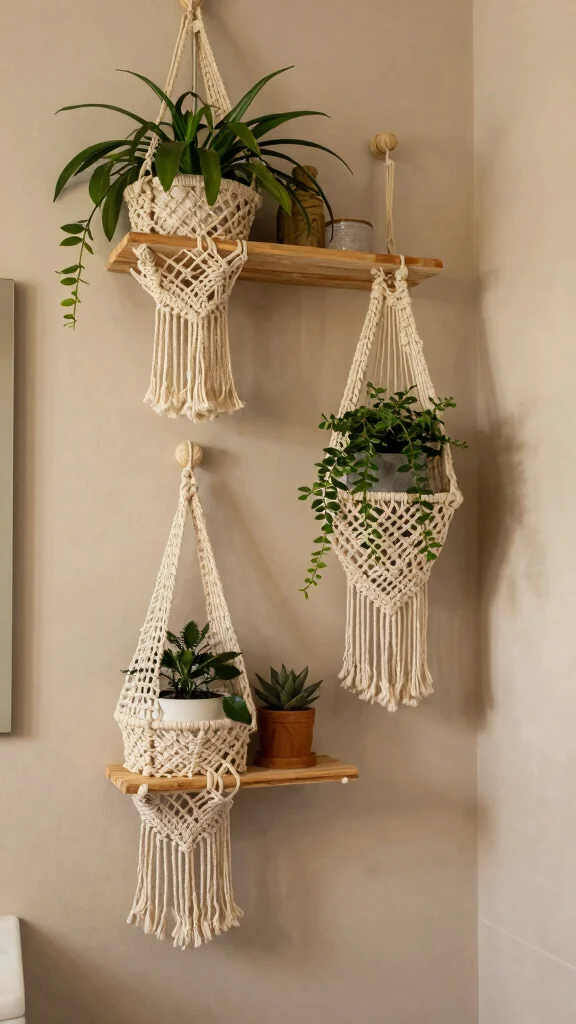 Introduce a bohemian touch to your bathroom with macrame hanging shelves. These intricately designed shelves add texture and warmth, providing a unique way to showcase your favorite items. Ideal for plants, candles, or decorative pieces, the soft knots and patterns create an artistic flair that enhances your decor.