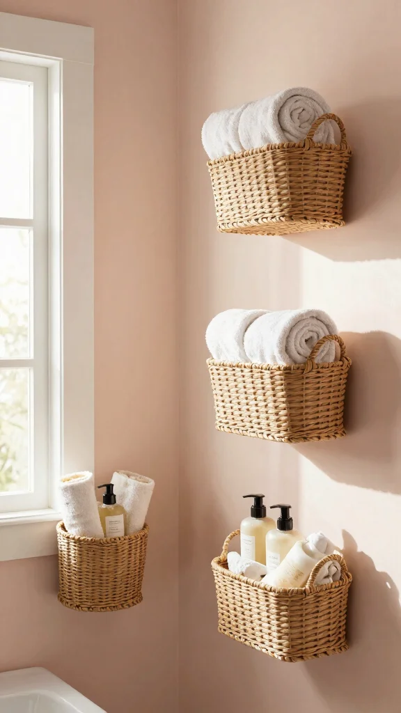Use simple wall mounts to keep surfaces clear, and add woven baskets or linen liners for extra storage and cozy space-saving decor.