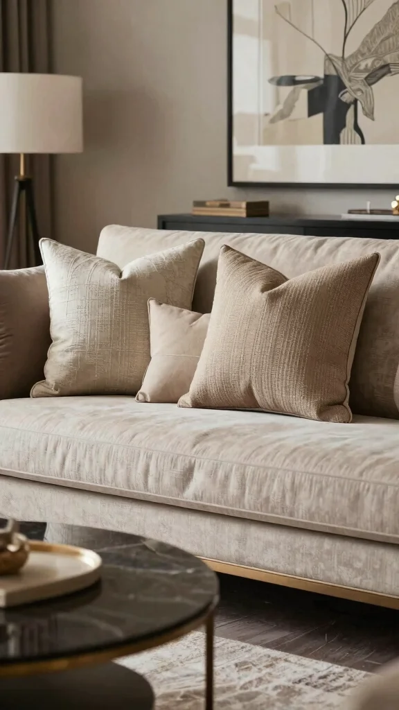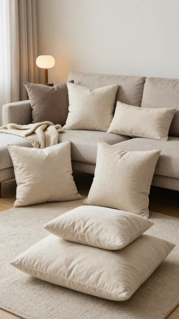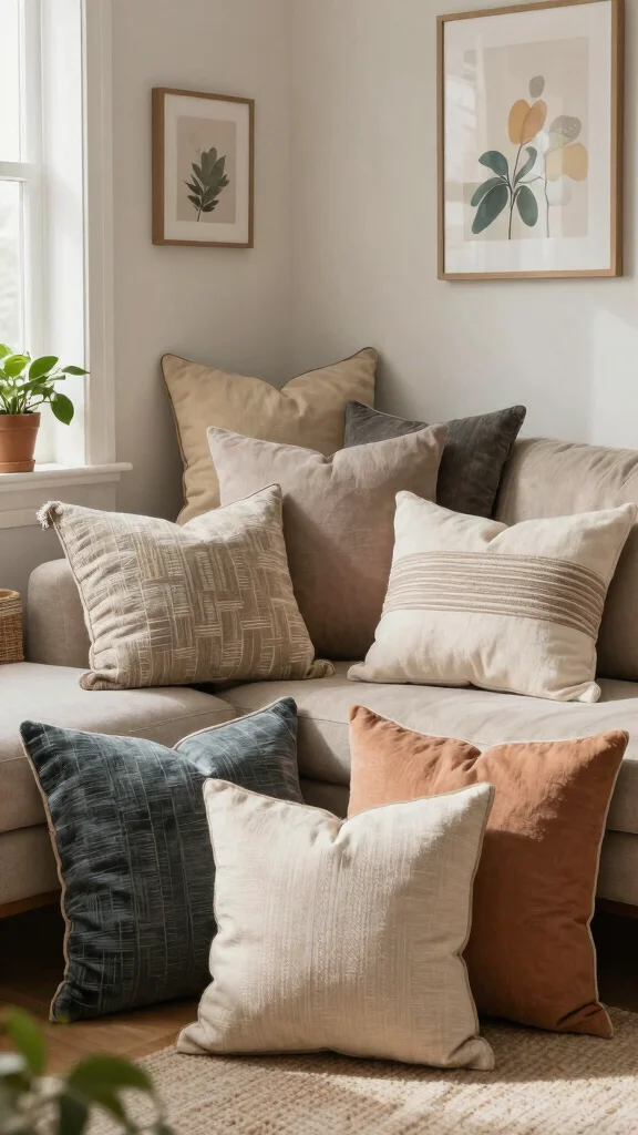 Vary the sizes and textures to create depth, and keep your color palette cohesive to support pillow styling ideas that elevate cozy living room decor and throw pillows design harmony.