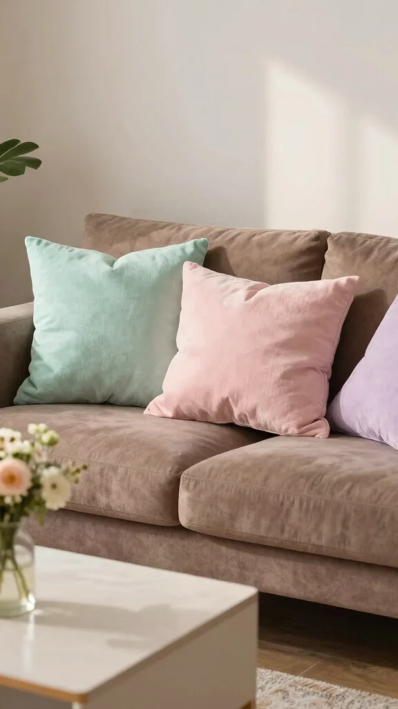 Soft pastel pillows create a soothing environment, especially when paired with a brown couch. These gentle colors add a subtle touch of brightness, enhancing the tranquility of your space without overwhelming it. Pastels evoke calmness and serenity, making them perfect for cozy living areas.