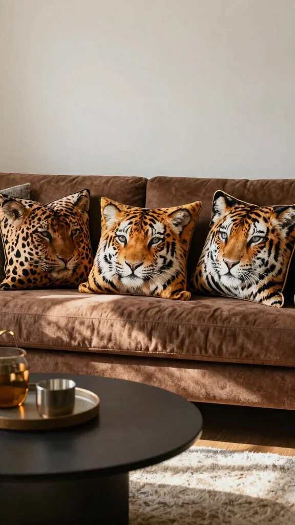 Animal prints bring a spirited vibe to your brown couch, reflecting your bold and unique style.