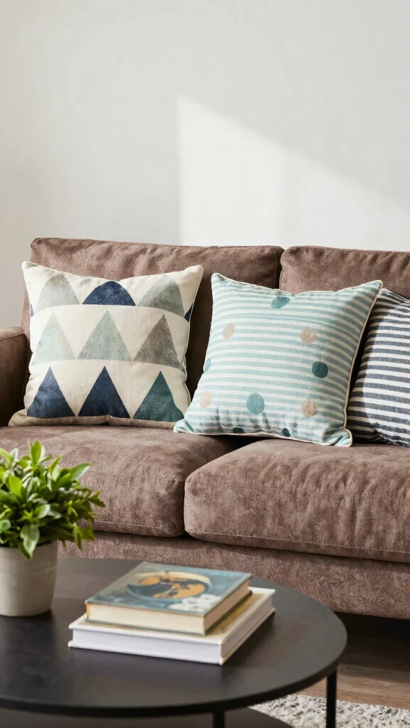 Choosing a color scheme that complements the brown couch, such as pillows with soft backgrounds, ensures a cohesive appearance. Mixing various geometric patterns can create an eclectic feel, as long as they share a common palette.