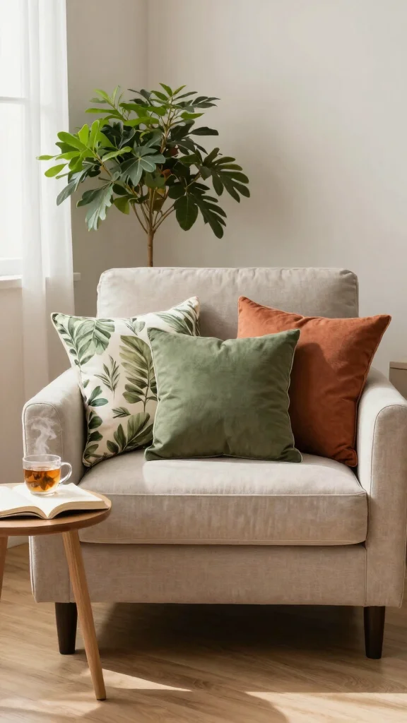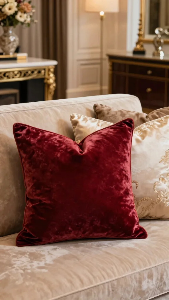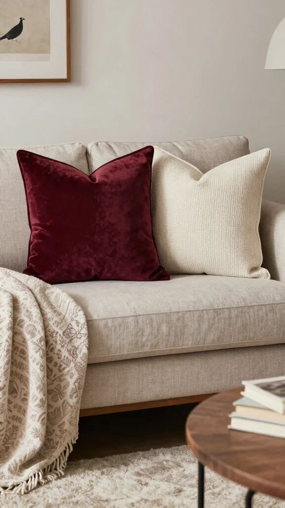 Select a deep burgundy velvet pillow for a touch of luxury, a cream knitted pillow for warmth, and a light linen pillow for balance. This thoughtful combination adds depth to your living room, creating a cozy spot perfect for relaxation.
