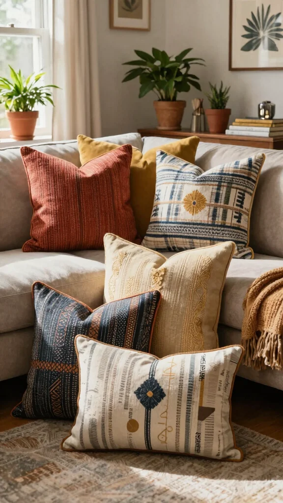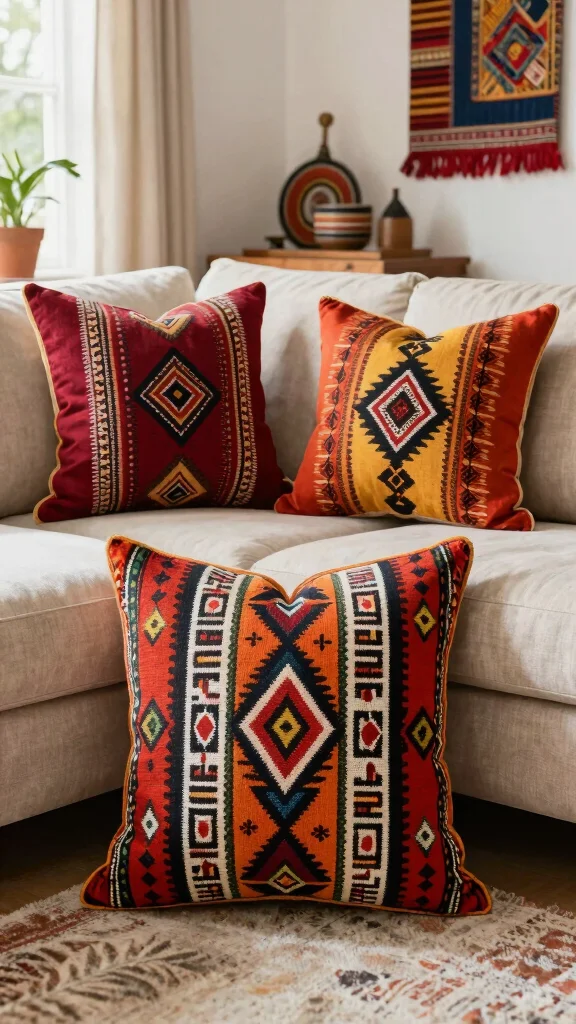 Select one bold-patterned pillow as the centerpiece, complemented by two solid colors that reflect shades from the pattern. This combination allows for a rich cultural mix while maintaining a cohesive appearance.
