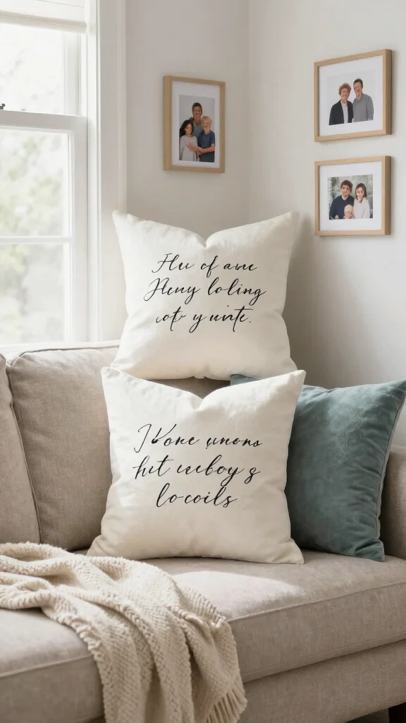 Arrange a large pillow featuring a beautiful quote in elegant script, alongside two smaller pillows in coordinating colors. This thoughtful arrangement creates a warm and inviting atmosphere, allowing you to share your story with visitors.