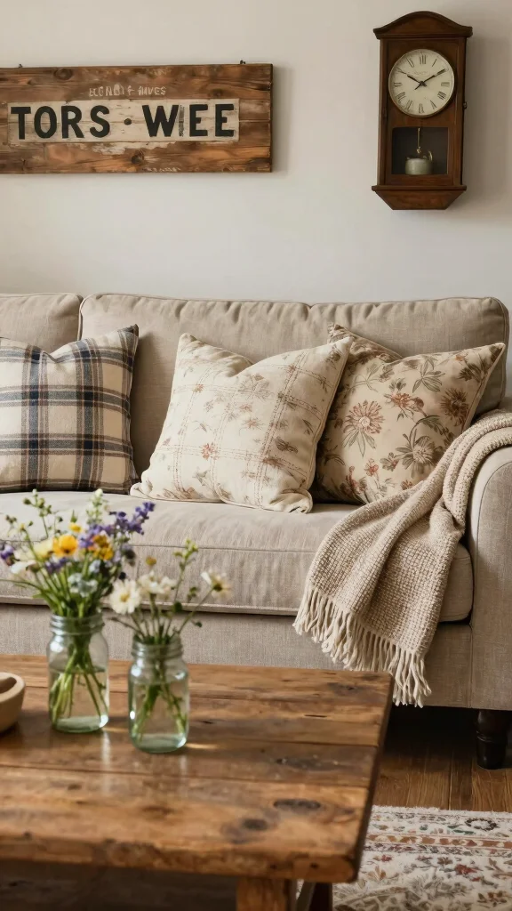 Arrange your pillows with a mix of textures: a plaid piece, a burlap option, and a small floral print. Layering these elements together will add warmth and a homely touch. Pair them with a light, weathered wood coffee table and mason jar decor to enhance the farmhouse vibe.