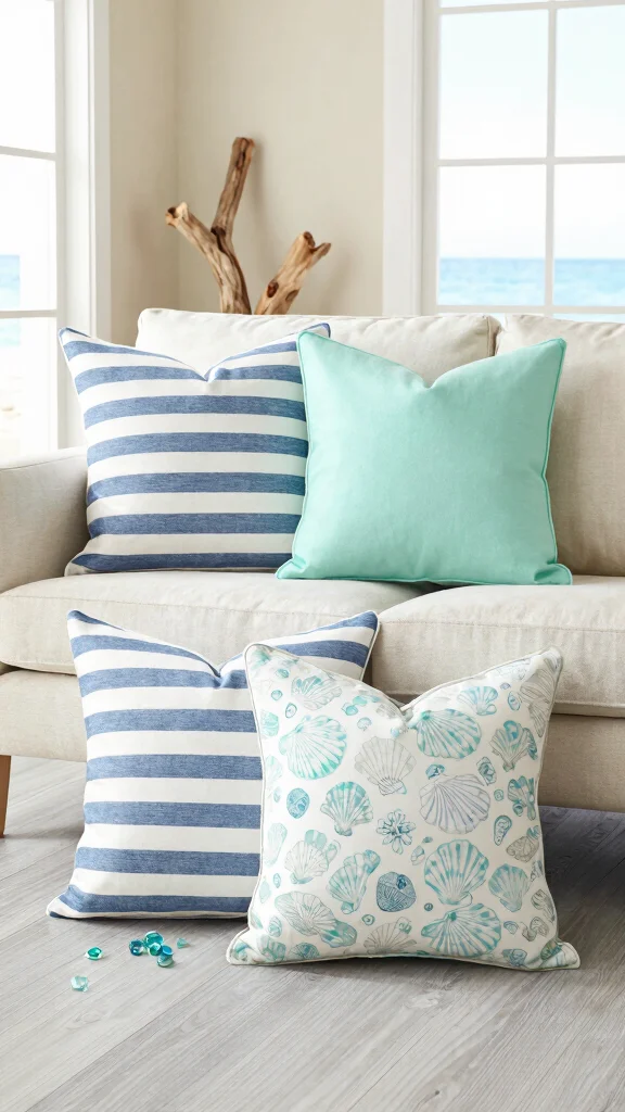 Select a striped pillow, a solid seafoam green option, and one with a subtle shell pattern to bring the coastal feel indoors. These colors harmonize beautifully with other nautical decor, such as driftwood accents and sea glass vases.