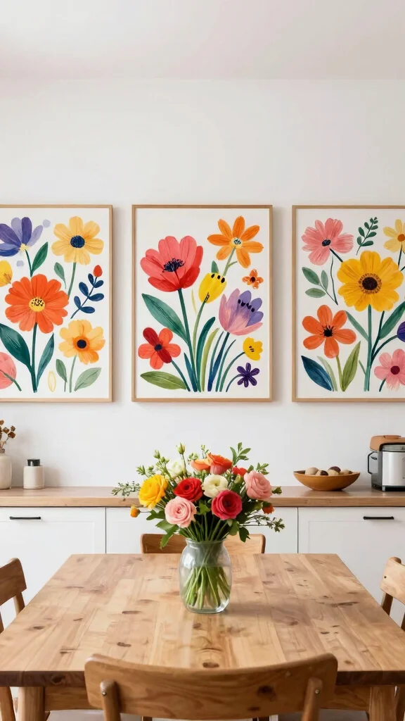 Floral art brings the beauty of nature indoors, and oversized pieces can make a significant impact. Imagine three large floral artworks that brighten up your space with vibrant colors and intricate details. This style can soften contemporary designs, adding a touch of romance and freshness.