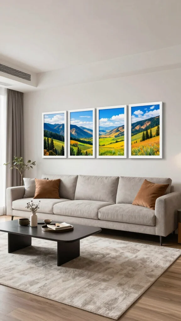 Fun fact: A symmetrical wall art 4 piece layout can calm a room and boost visual harmony around a central feature like a sofa. In modern minimalist spaces, this balanced setup can reduce perceived clutter by up to 30%, making the space feel more inviting.