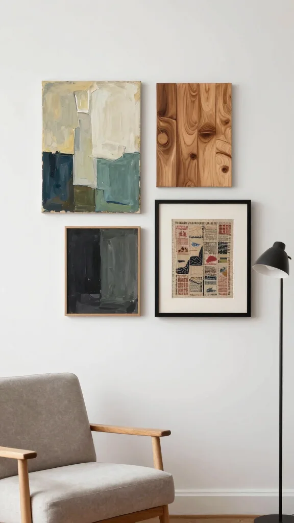 Layering various art mediums can add a unique dimension to your wall. A four-piece set showcasing different materials—like canvas, wood, and metal—creates striking visual appeal while maintaining a modern minimalist vibe.