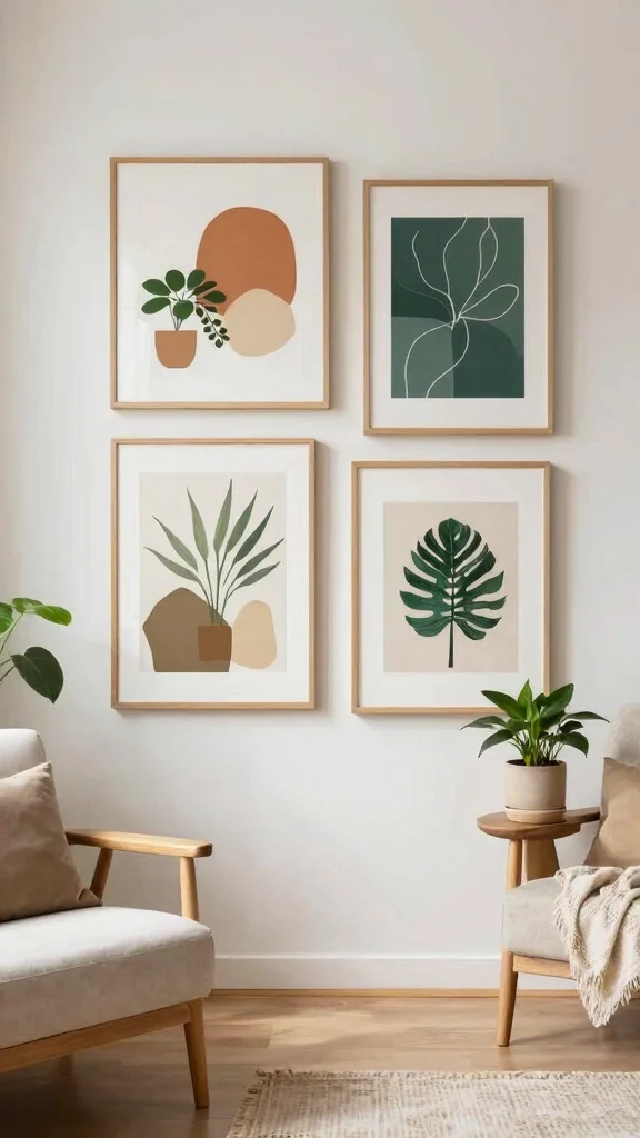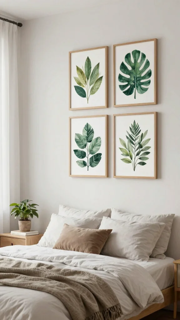 Incorporating elements of nature into your decor can foster a serene atmosphere. A four-piece art set featuring botanical prints or peaceful landscapes enhances your connection to the outdoors. This layout is ideal for spaces where tranquility is desired.