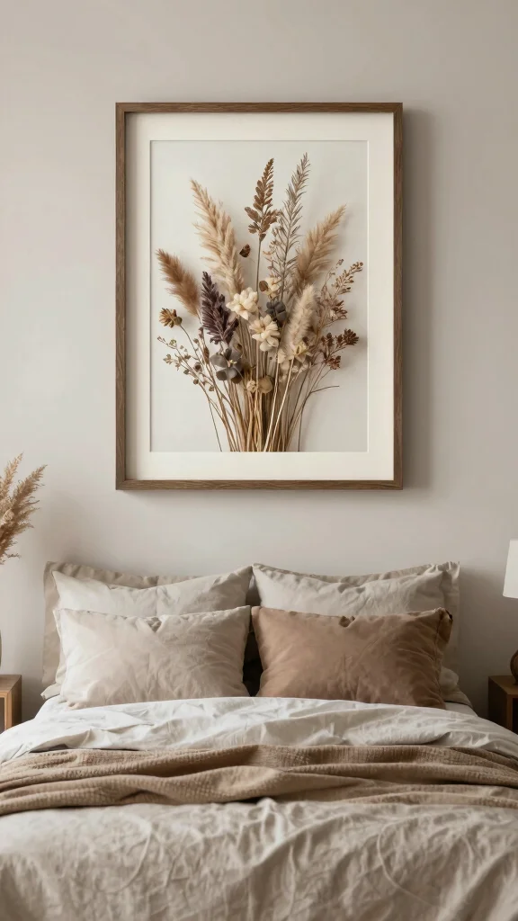 Dried flower arrangements make a stunning addition to your wall decor, beautifully marrying nature with art in a bohemian style. These arrangements add organic beauty and texture to your space, creating a calming focal point above your bed. Framing individual dried stems or crafting larger displays in shadow boxes can elevate their visual appeal.