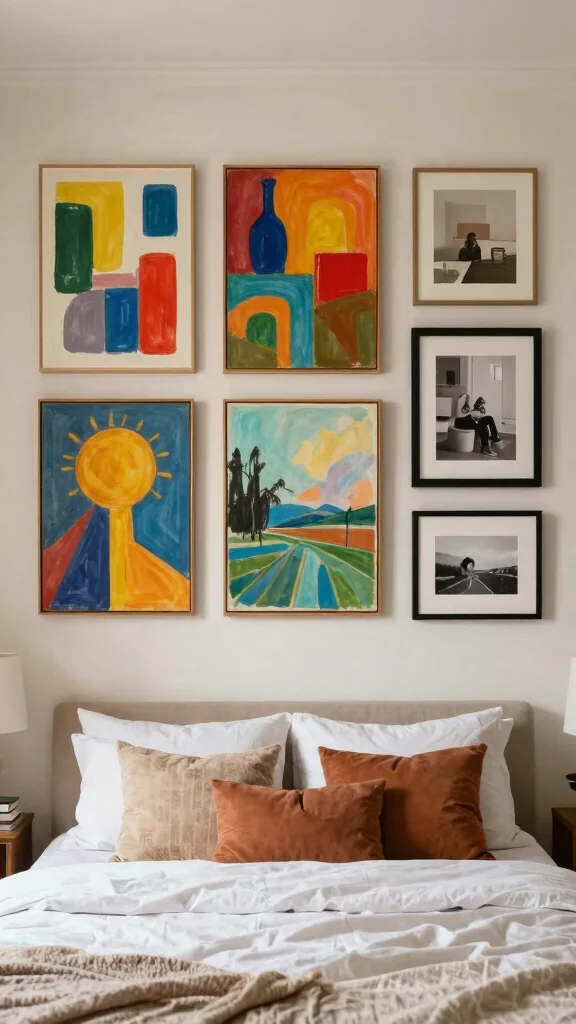 Arranging artwork at varying heights not only adds depth but also invites conversation, making your bedroom truly distinctive.