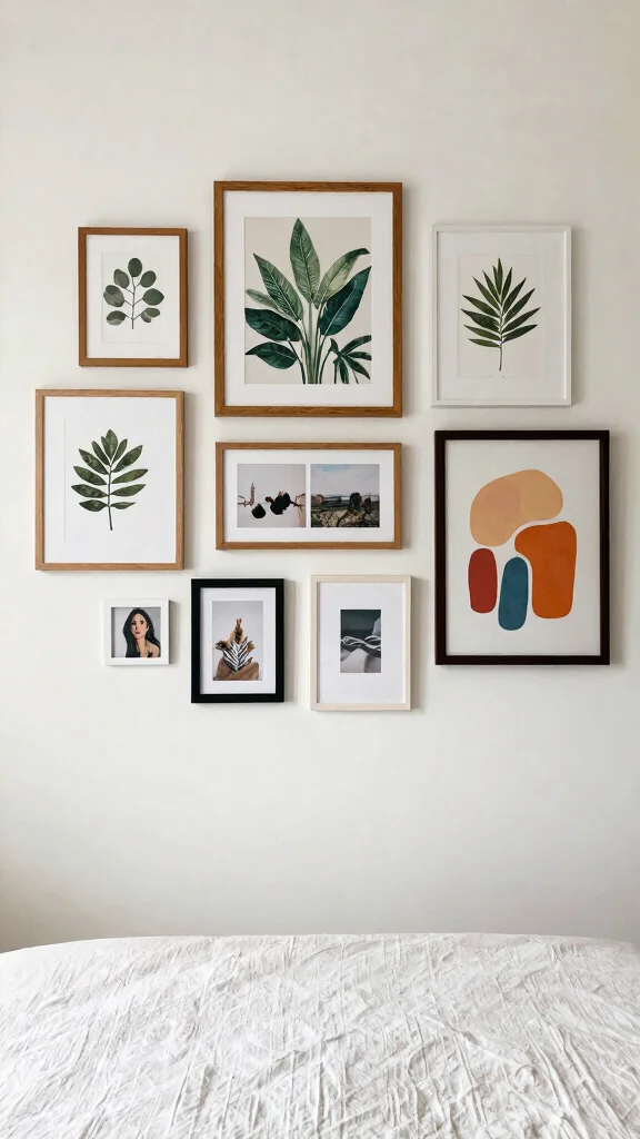 If you’re mounting a gallery or a cluster, leave about 2–6 inches of space between frames and 6–12 inches above the headboard. For above bed decoration, align the grouping with the width of the headboard and keep the overall width similar to or slightly less than the bed.