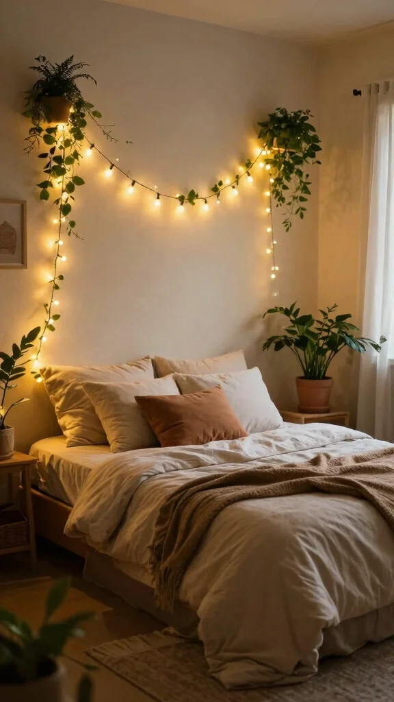 Fun fact: Warm white string lights can boost cozy vibes by up to 25%, instantly highlighting wall art above bed. Hang them in curves or zig-zags to sparkle without overwhelming your space. It’s a simple boho touch that makes the room feel inviting.
