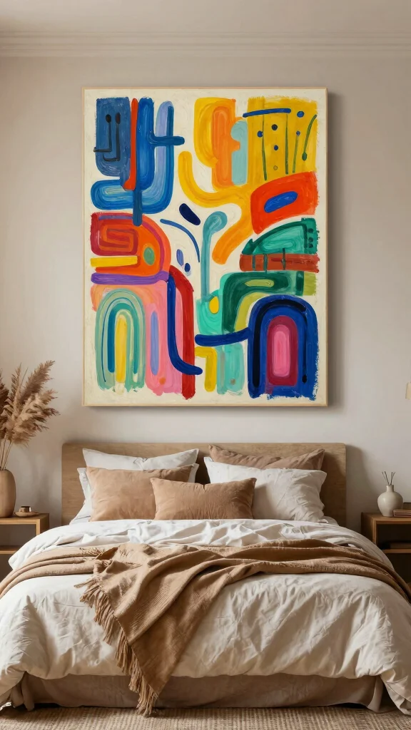 3. Consider Furniture Scale: The size of your bed and nightstands matters. A large artwork looks best above a king bed, while smaller pieces suit twin or full beds.