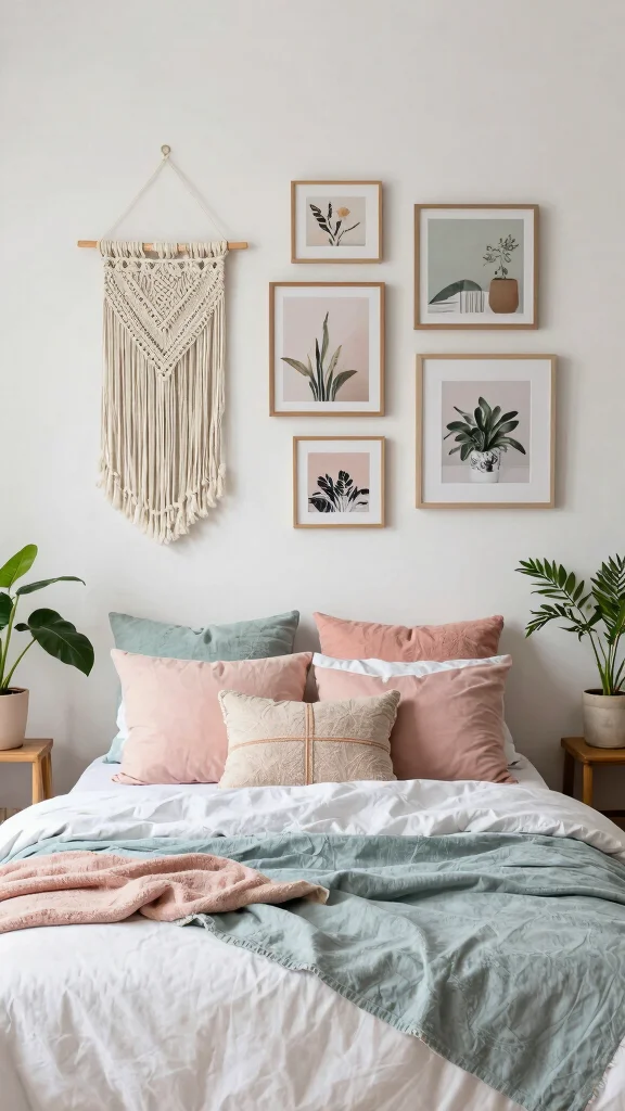 Limit to 3 main tones, mix textures (soft fabrics, matte prints, a touch of metallic), and keep frames cohesive in wood or rattan to reinforce a bohemian wall art above bed look.