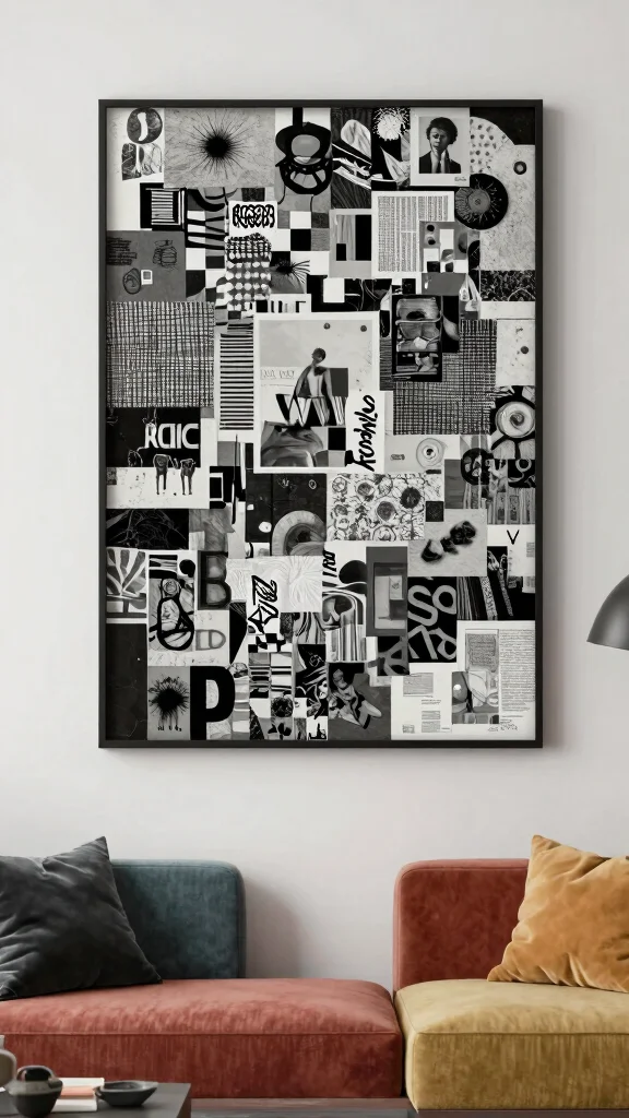When integrating collage art into your decor, consider choosing either a striking single piece or a series of smaller collages for a dynamic display. Pair them with patterned frames for added flair, creating an engaging contrast with the art.