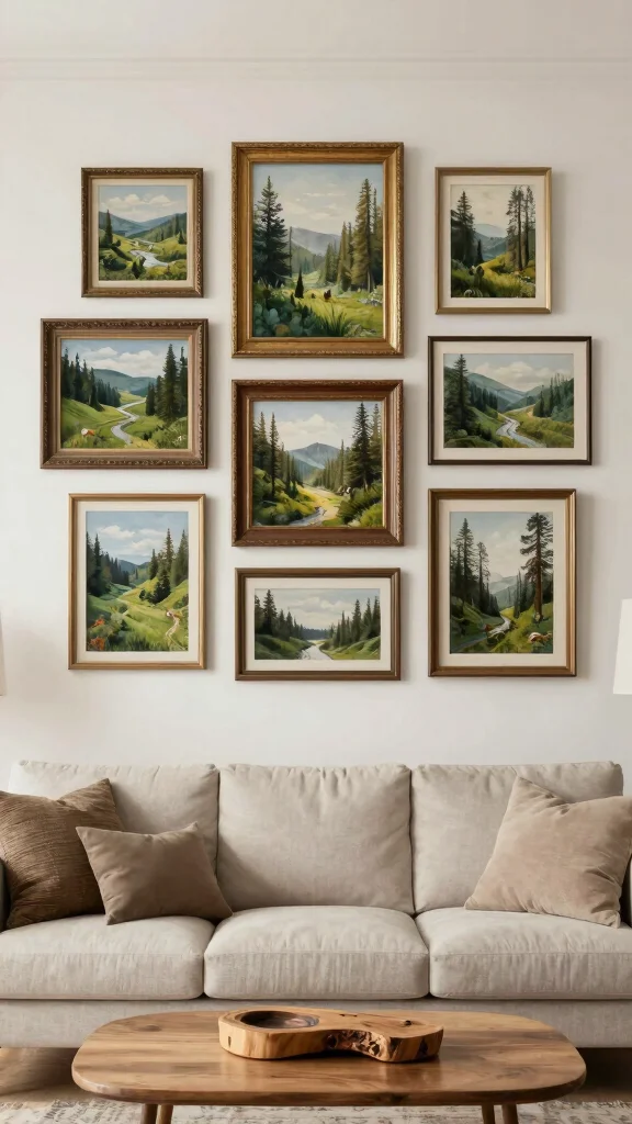 How do I arrange a gallery wall of outdoor-themed artwork in a small space?