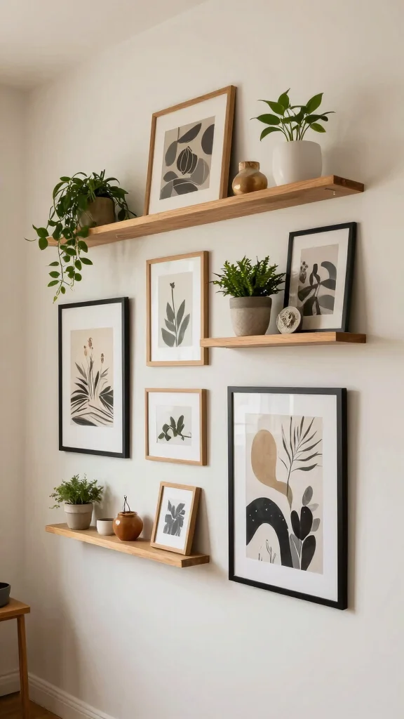 In compact spaces, combining wall shelves with art optimizes both functionality and style. Incorporate beautiful shelves into your gallery wall to display smaller art pieces, plants, or decorative trinkets. This fusion adds dimension, making your wall feel lively and engaging.