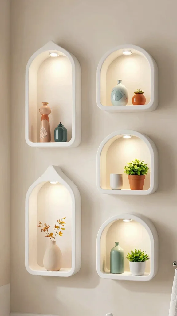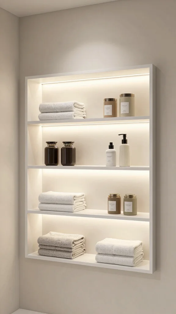 For a built‑in feel, consider recessed niches with white backs that blend with the wall, offering hidden storage as part of your interior design tips for modern bathroom decor.