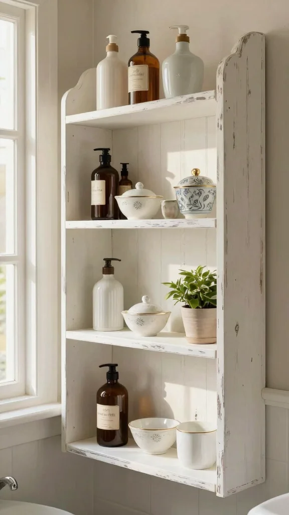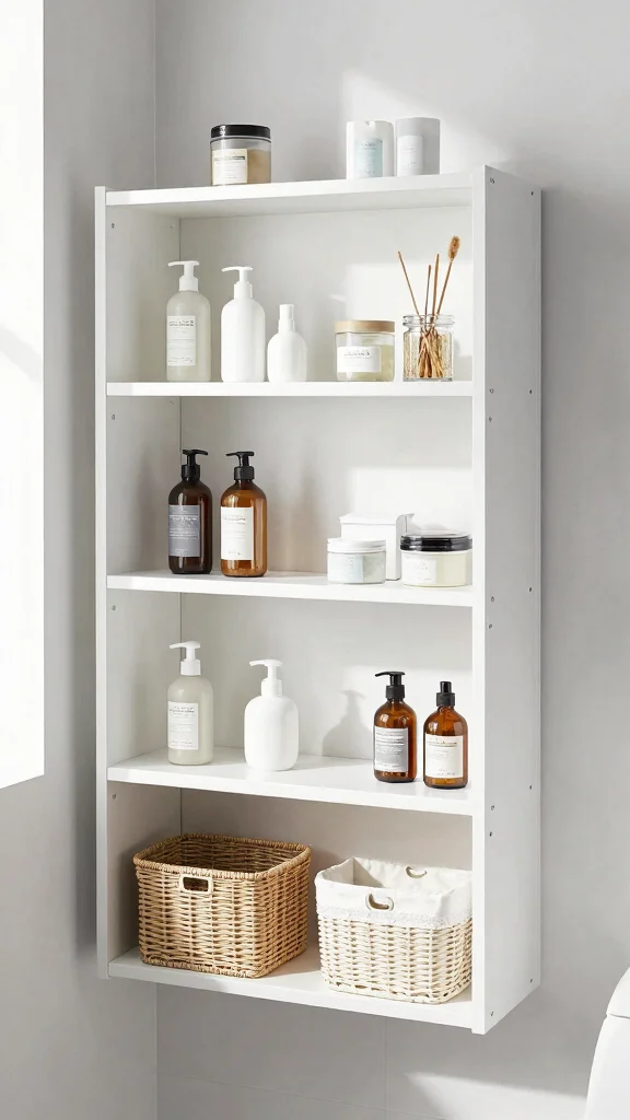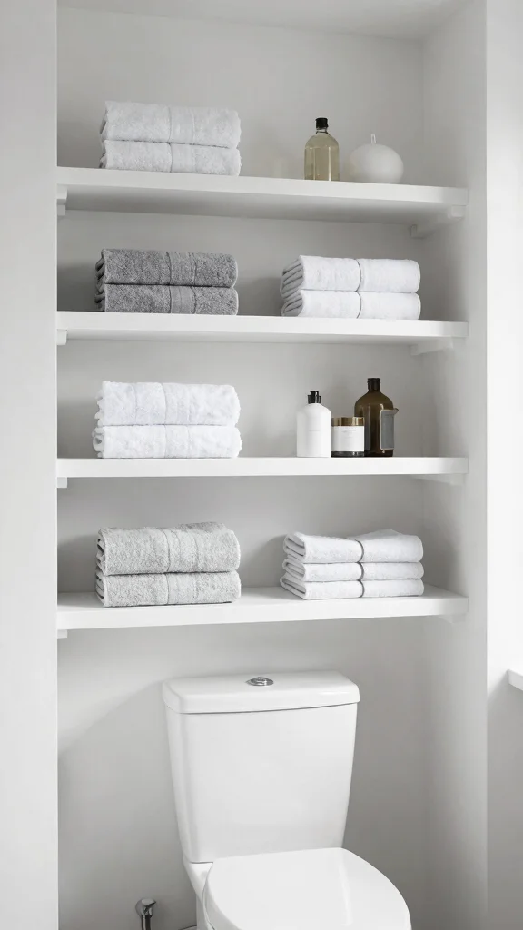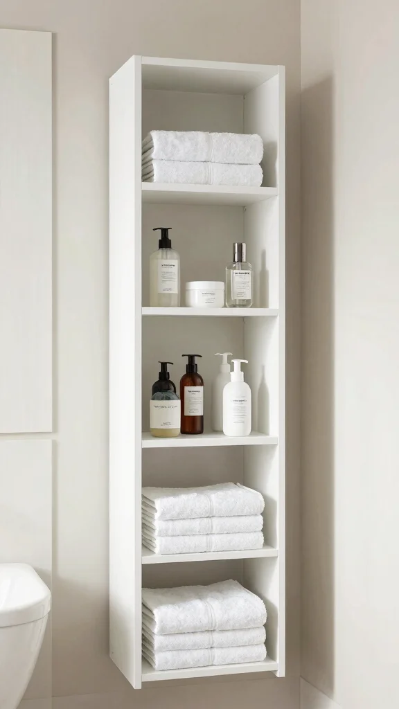 Vertical space is your friend in a small bathroom. Install tall, slim white shelves on an empty wall or above the toilet to reclaim precious floor space.